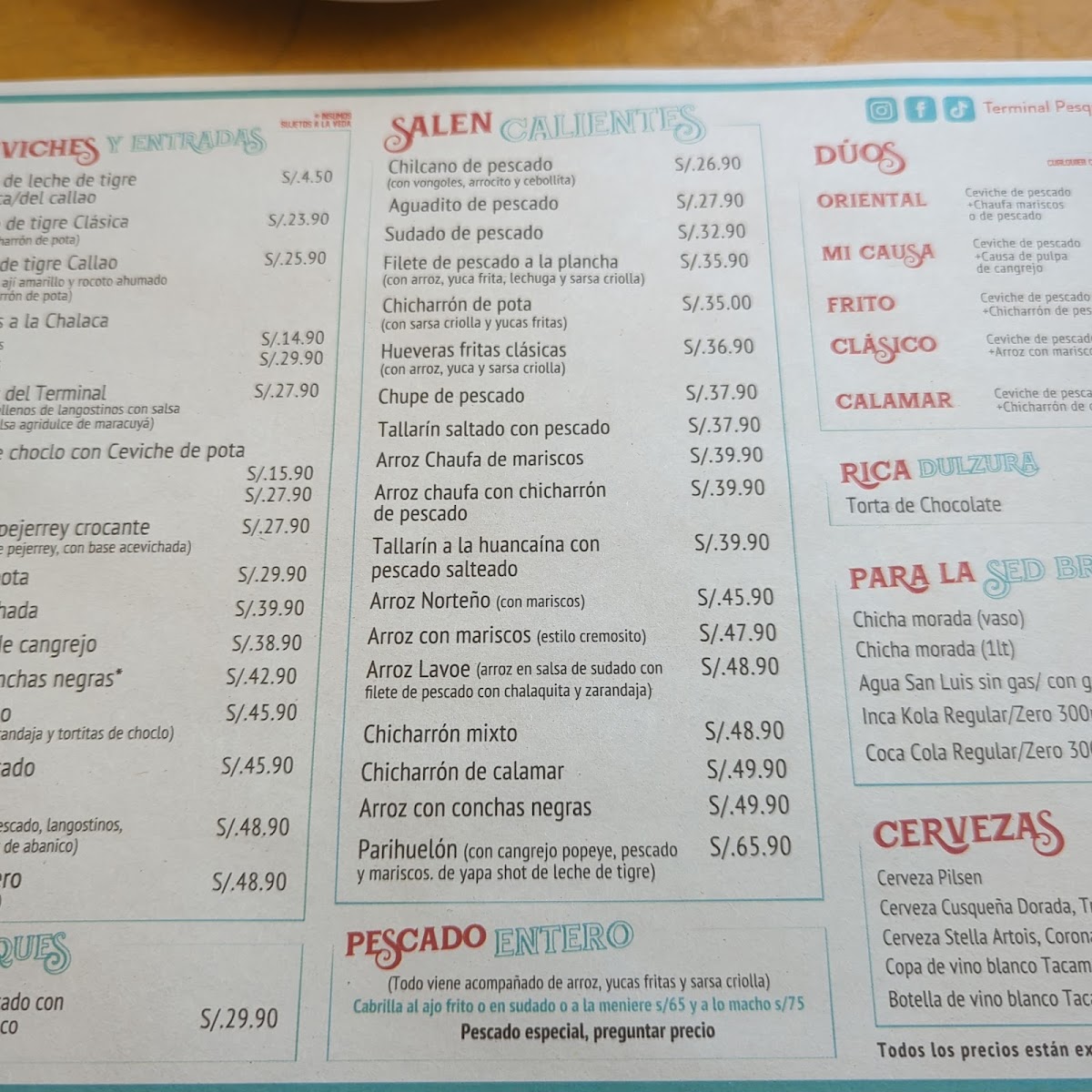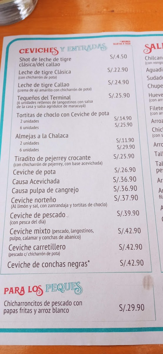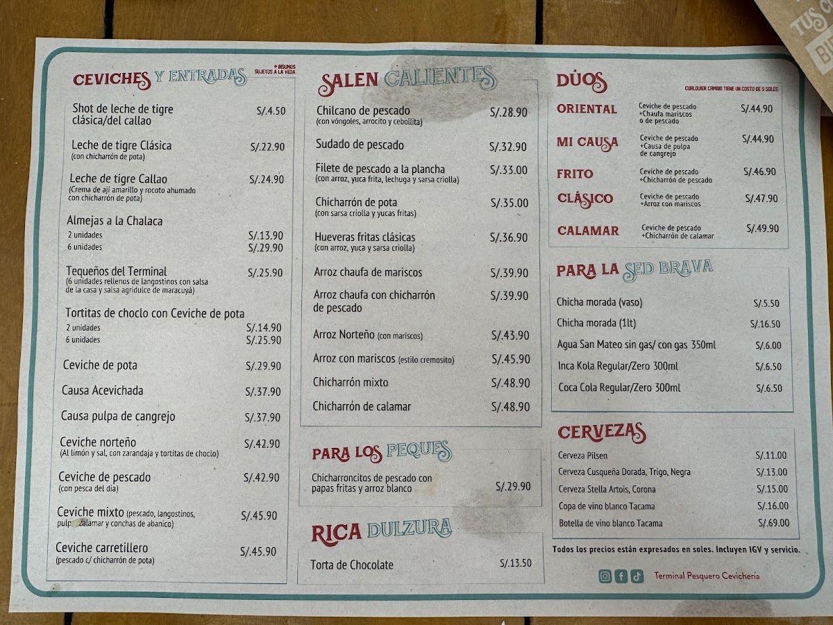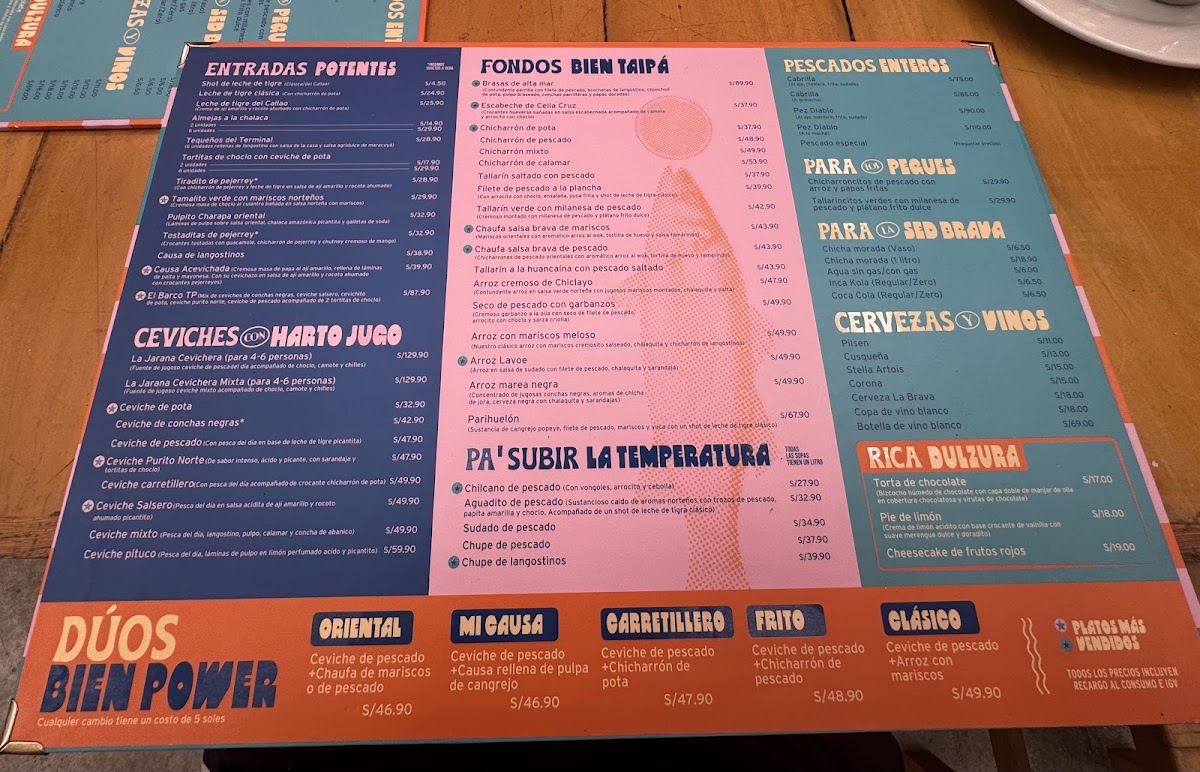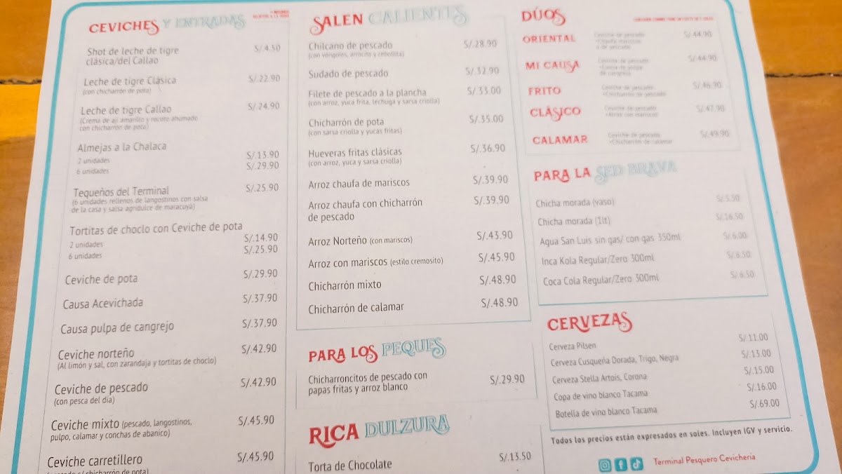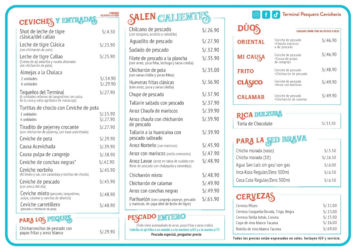 The menu at Terminal Pesquero Cevichería Punta Hermosa offers a delectable array of seafood dishes that showcase the best of Peru's coastal flavors. For a standout experience, the Trio de Ceviche de Pescado Causa Con Pulpa de Cangrejo Y Chicharron is an absolute must-try, combining fresh fish ceviche with crab pulp and crispy chicharrón, creating a unique burst of textures and flavors. The Chicharrón de Pescado is another highlight, offering a crispy, golden exterior and tender fish within, perfect for those craving a savory bite. If you’re in the mood for something light yet flavorful, the Ceviche Tostada delivers the perfect balance of tangy and crunchy with its crispy tostada base. Finally, the Parihuela, a rich seafood soup, brings together the deep flavors of mixed seafood in a satisfying and comforting broth. With its diverse menu, Terminal Pesquero Cevichería Punta Hermosa promises an unforgettable culinary journey for seafood enthusiasts.